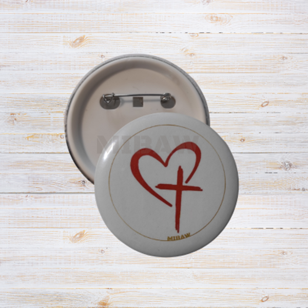 Au centre du badge, un motif de cœur est représenté, étreignant tendrement une croix. Ce cœur symbolise l'amour inconditionnel de Dieu pour l'humanité, tandis que la croix évoque le sacrifice rédempteur de Jésus pour nos péchés.