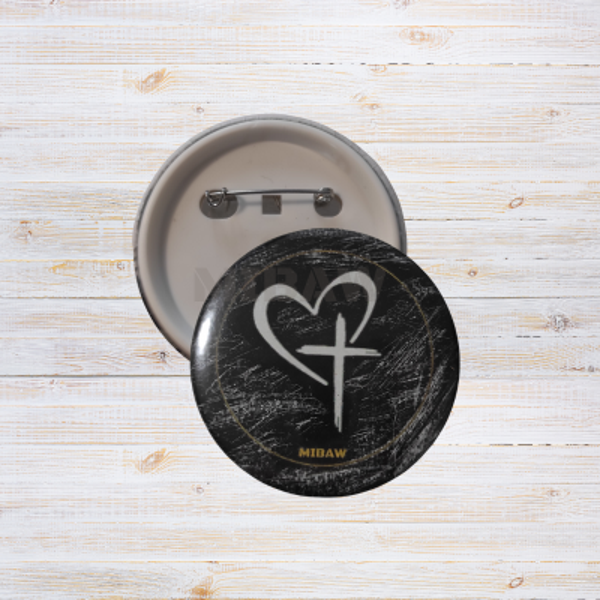 Au centre du badge, un motif de cœur est représenté, étreignant tendrement une croix. Ce cœur symbolise l'amour inconditionnel de Dieu pour l'humanité, tandis que la croix évoque le sacrifice rédempteur de Jésus pour nos péchés.
