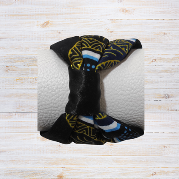 Osez briller avec éclat grâce au bracelet nœud-manchette MIBAW en tissu wax, une fusion audacieuse de noir, blanc, bleu, et de paillettes dorées étincelantes ! Ce bijou est l'incarnation même du style sophistiqué et de l'élégance moderne, conçu pour captiver les regards où que vous alliez.